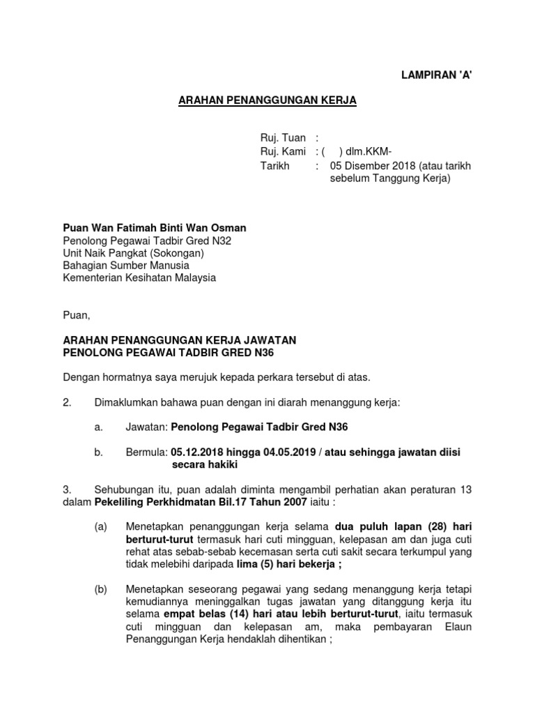 ARAHAN PENANGGUNGAN KERJA Ruj. Lampiran A - Contoh Surat Arahan Tanggung Kerja dalam format PDF. Pertukaran dan pusingan kerja akan dapat memberi perkhidmatan yang cemerlang.